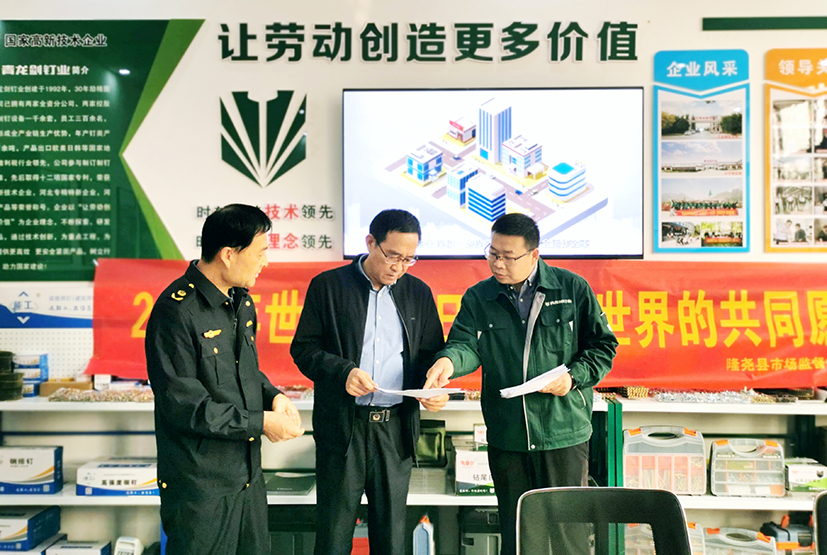 今年10月14日是第54屆世界標準日,主題為“美好世界的共同愿景”。為進一步推廣標準化理念,提高標準化意識,提升標準化總體水平,深入推進標準化戰(zhàn)略,10月12日,隆堯縣市場監(jiān)督管理局副局長張彥國給青龍劍公司送來釘類產品國家標準。