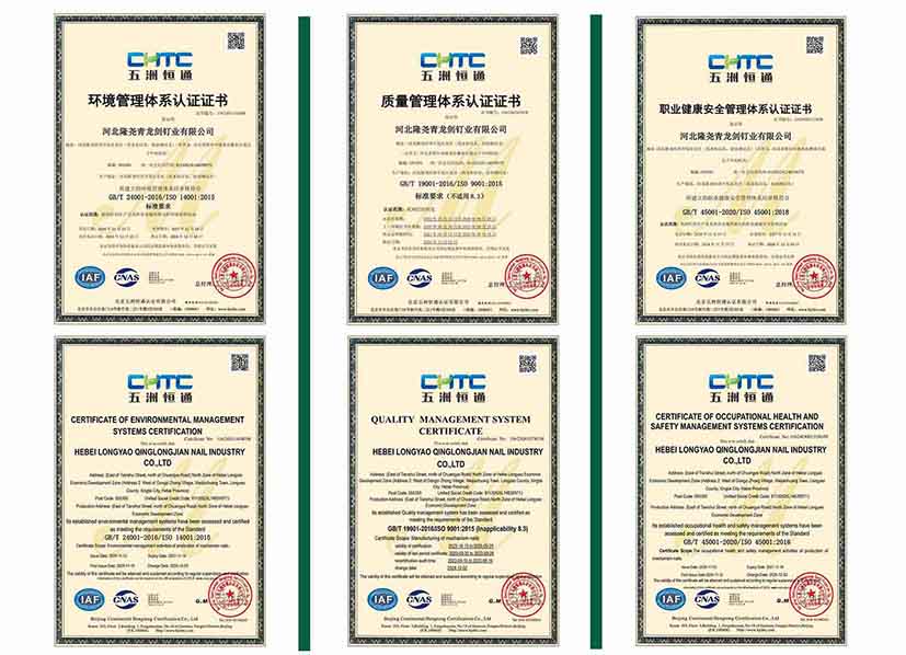 公司始終以“讓勞動創造更多價值”為企業理念,致力于生產優質高效的釘類產品。本次通過科學的管理體系和方法,不斷提升產品質量與服務水平。此次公司通過了多項體系認證,標志著青龍劍公司一直保持符合國際標準化的管理體系要求,進一步鞏固了青龍劍在行業中的領先地位。