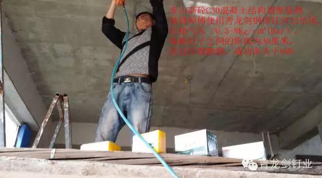 裝修工程隊(duì)使用青龍劍鋼排釘ST32對使用奎山商砼C30混凝土結(jié)構(gòu)的別墅進(jìn)行裝修吊頂 。(C30等級(jí)的混凝土幾乎可以適用于所有工業(yè)與民用建筑物、構(gòu)筑物的各種構(gòu)件)。